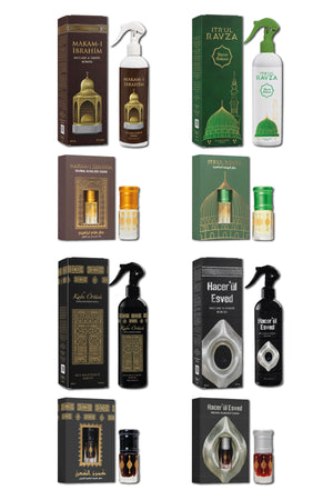 Bu premium set, en çok tercih edilen dört manevi kokunun hem Seccade & Tekstil Spreyi hem de Alkolsüz Esans versiyonlarını bir araya getirir. Hac & Umre hediyelikleri, manevi özel günler, mevlid, kandil hediyeleri ve ev kullanımı için mükemmel bir seçimdir.