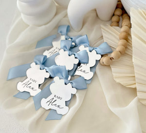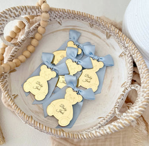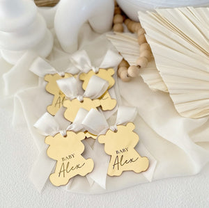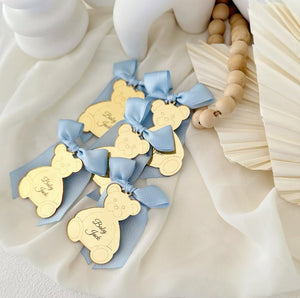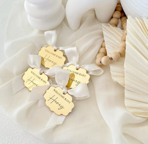 Altın aynalı pleksi malzeme üzerine lazer kazımalı kişiye özel yazı ve fiyonk şeklinde bağlanmış zarif kurdele ile hazırlanan bu hediyelik; düğün, nişan, söz, mevlüt, baby shower ve doğum gibi anlamlı günlerinizde konuklarınıza manevi bir hatıra sunar.