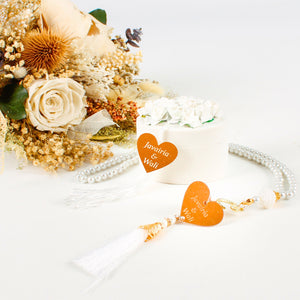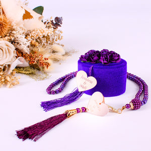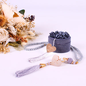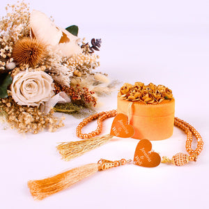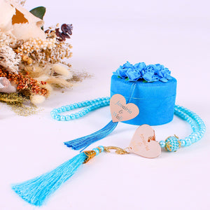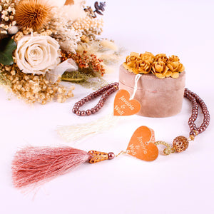 Kadife kaplı çiçekli kutu içinde yer alan inci görünümlü tesbih, altın renk püskül detayı ve kişiye özel yazılı pleksi etiketiyle hem göz alıcı hem de manevi değeri yüksek bir hediye sunar.
