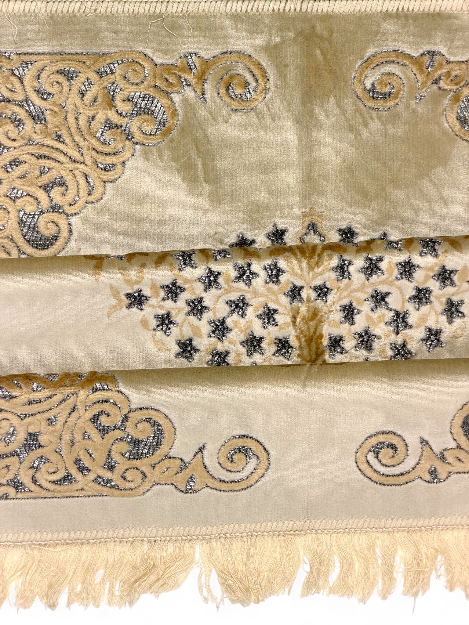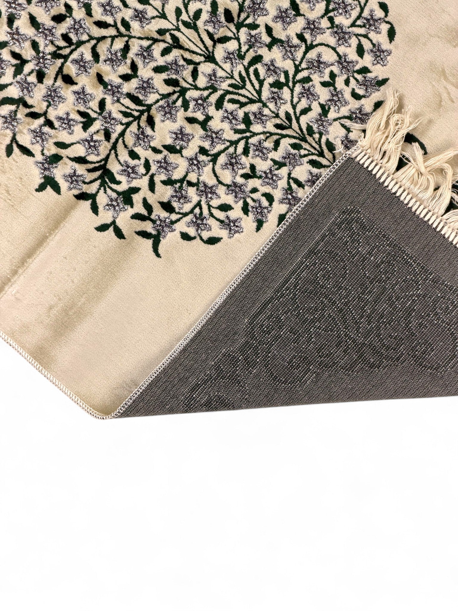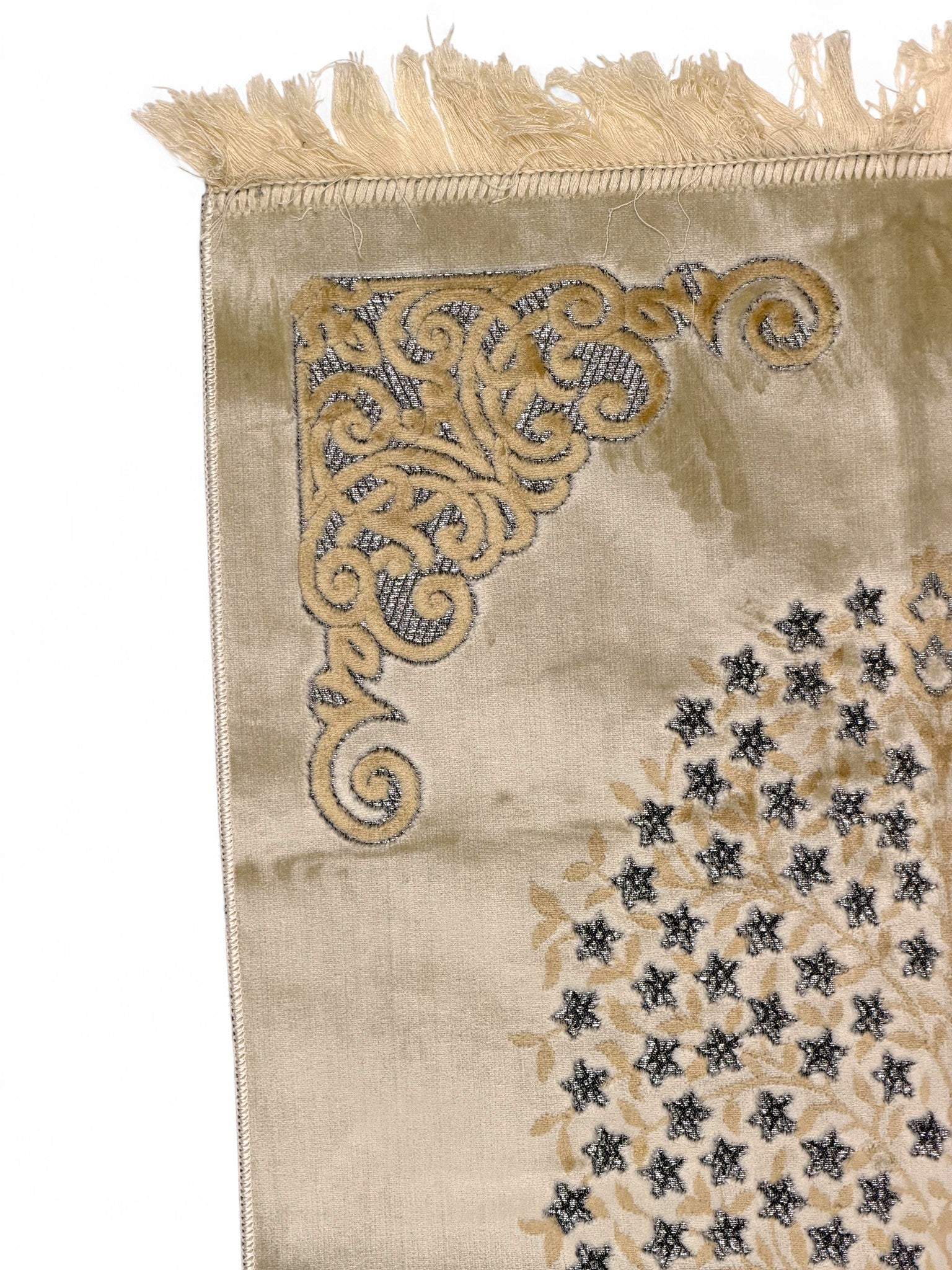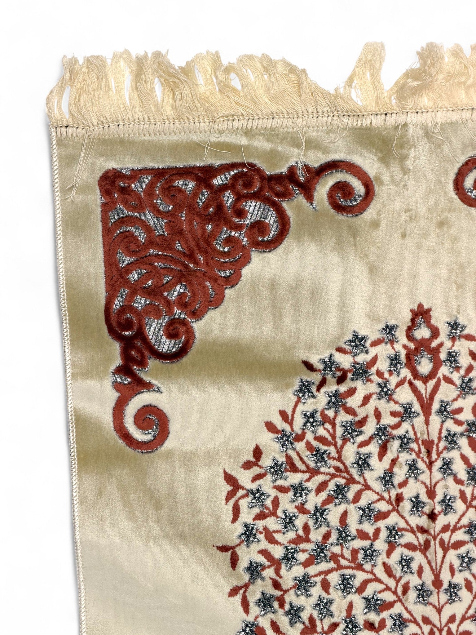 Bu kadife simli dokuma seccade, özel dokusu ve göz alıcı desenleriyle hem klasik hem modern bir şıklık sunar. İnce sim detayları, seccadenin ışıkla buluştuğu her anda ışıltılı bir görünüm oluşturur.