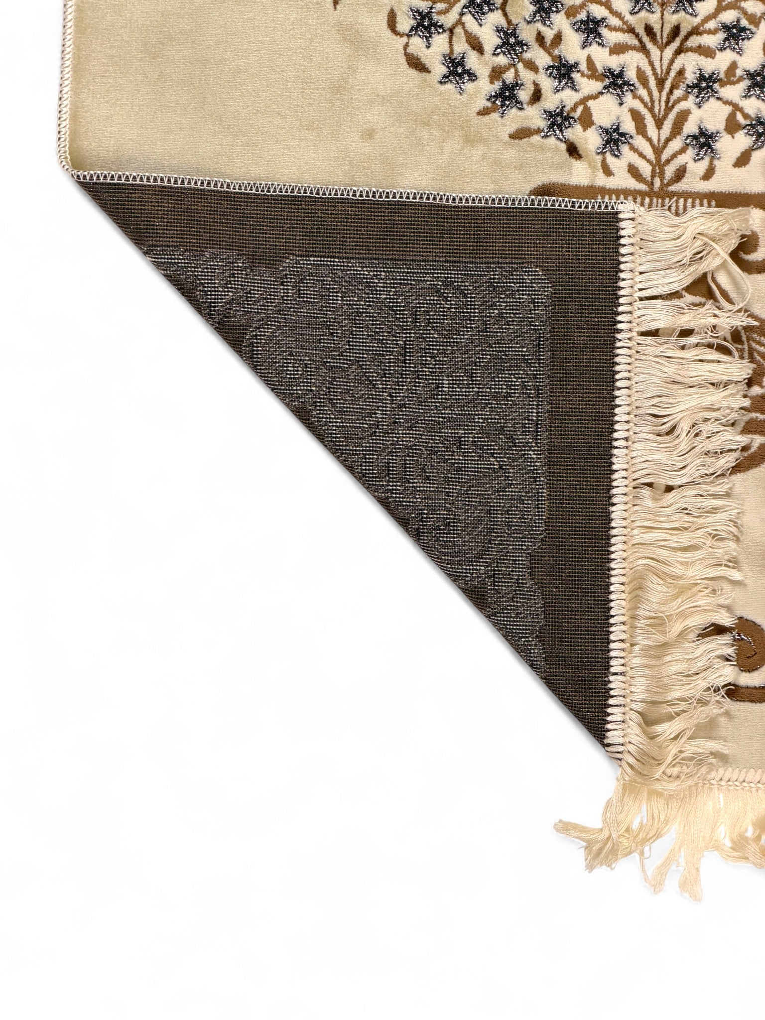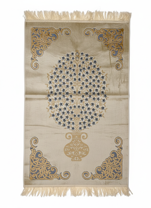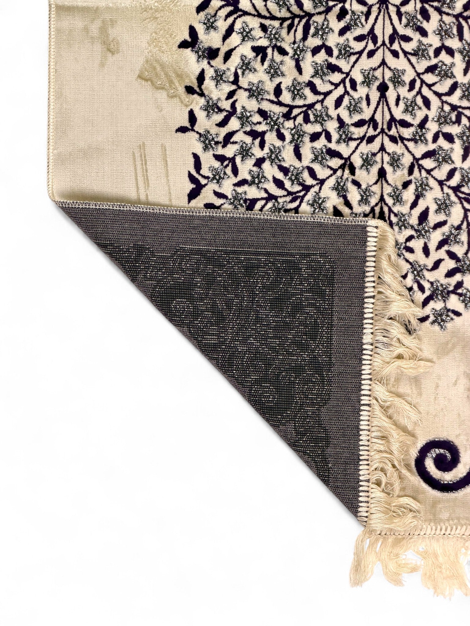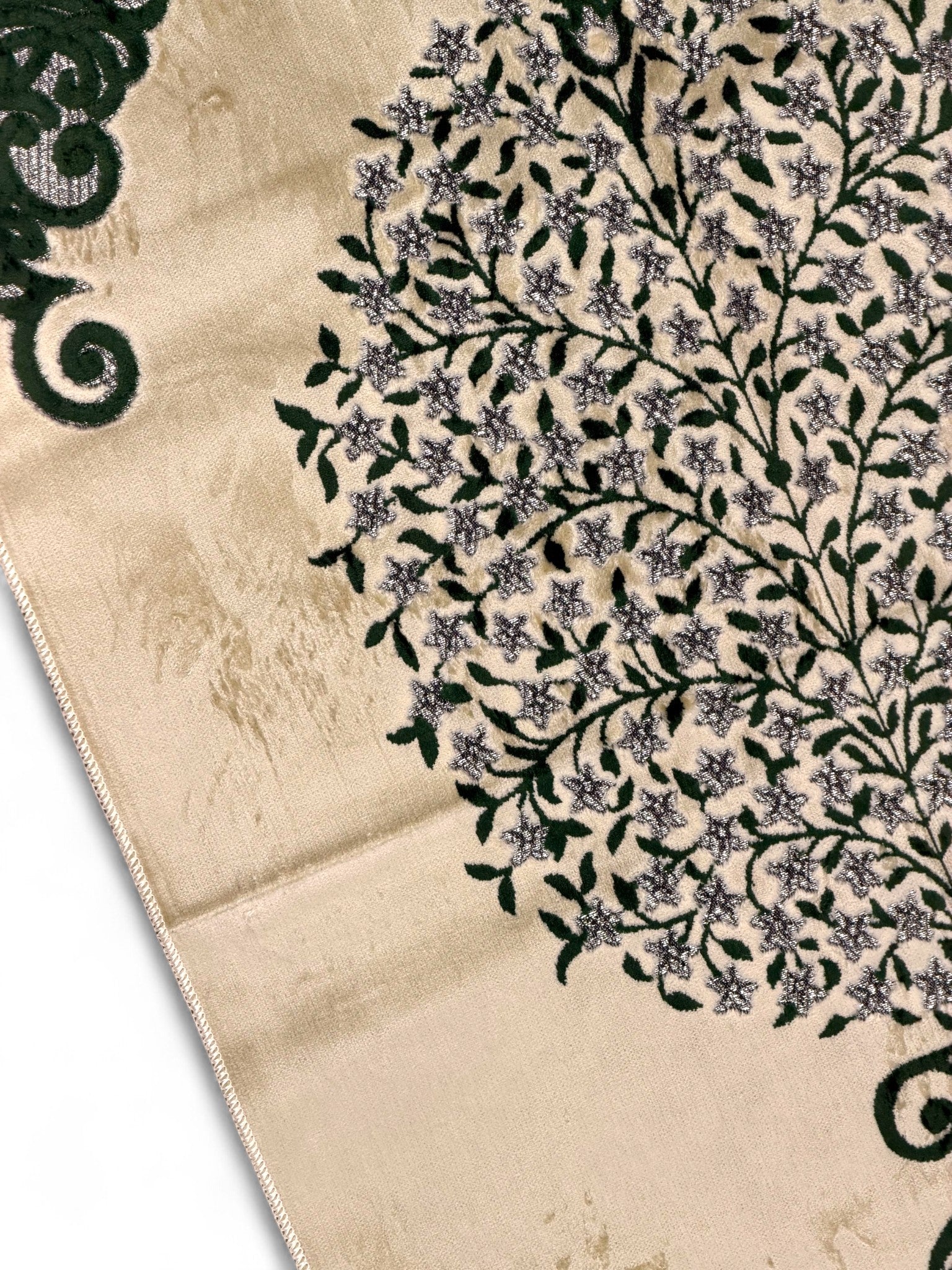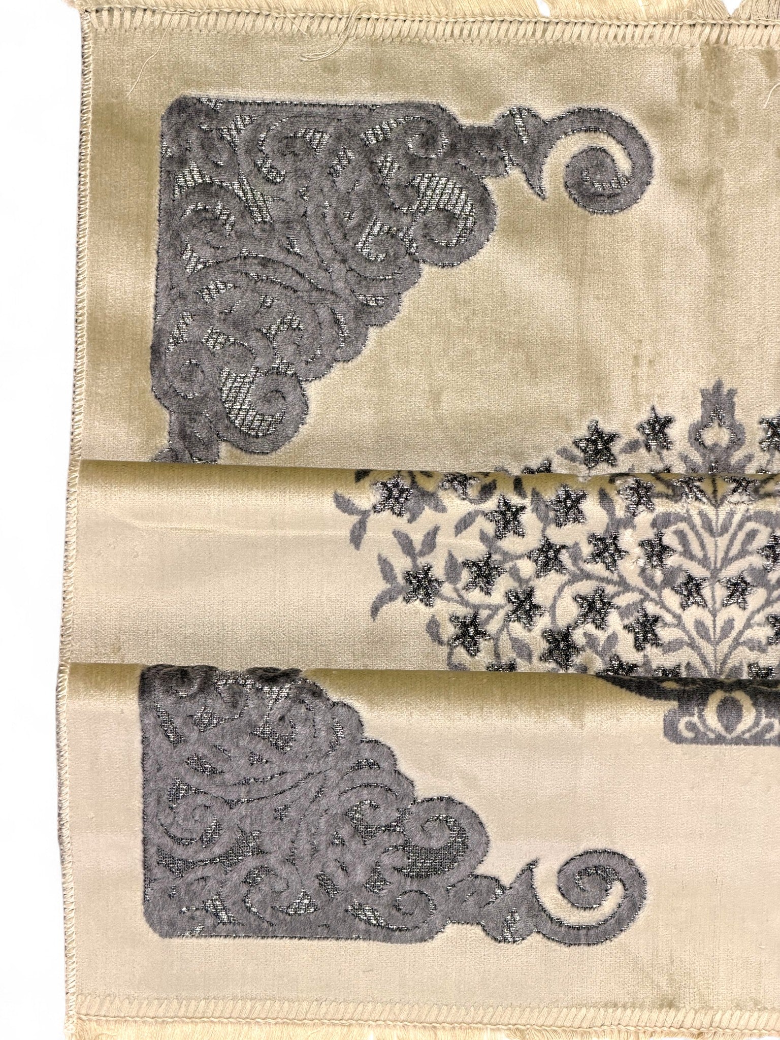 Bu kadife simli dokuma seccade, özel dokusu ve göz alıcı desenleriyle hem klasik hem modern bir şıklık sunar. İnce sim detayları, seccadenin ışıkla buluştuğu her anda ışıltılı bir görünüm oluşturur.