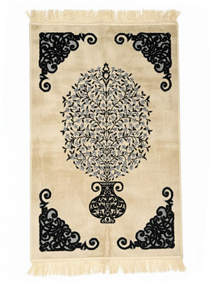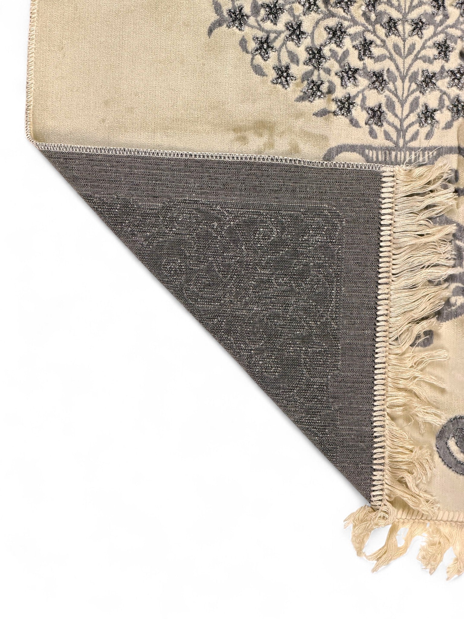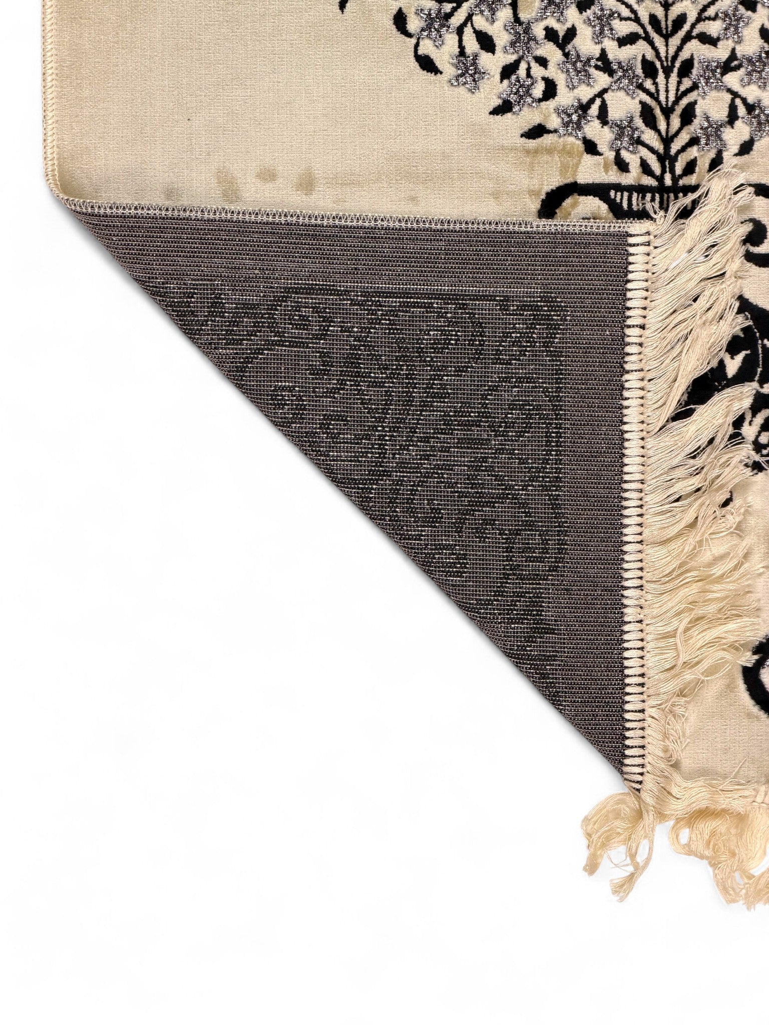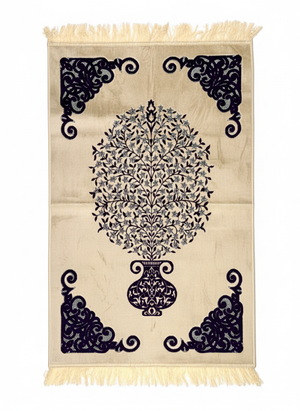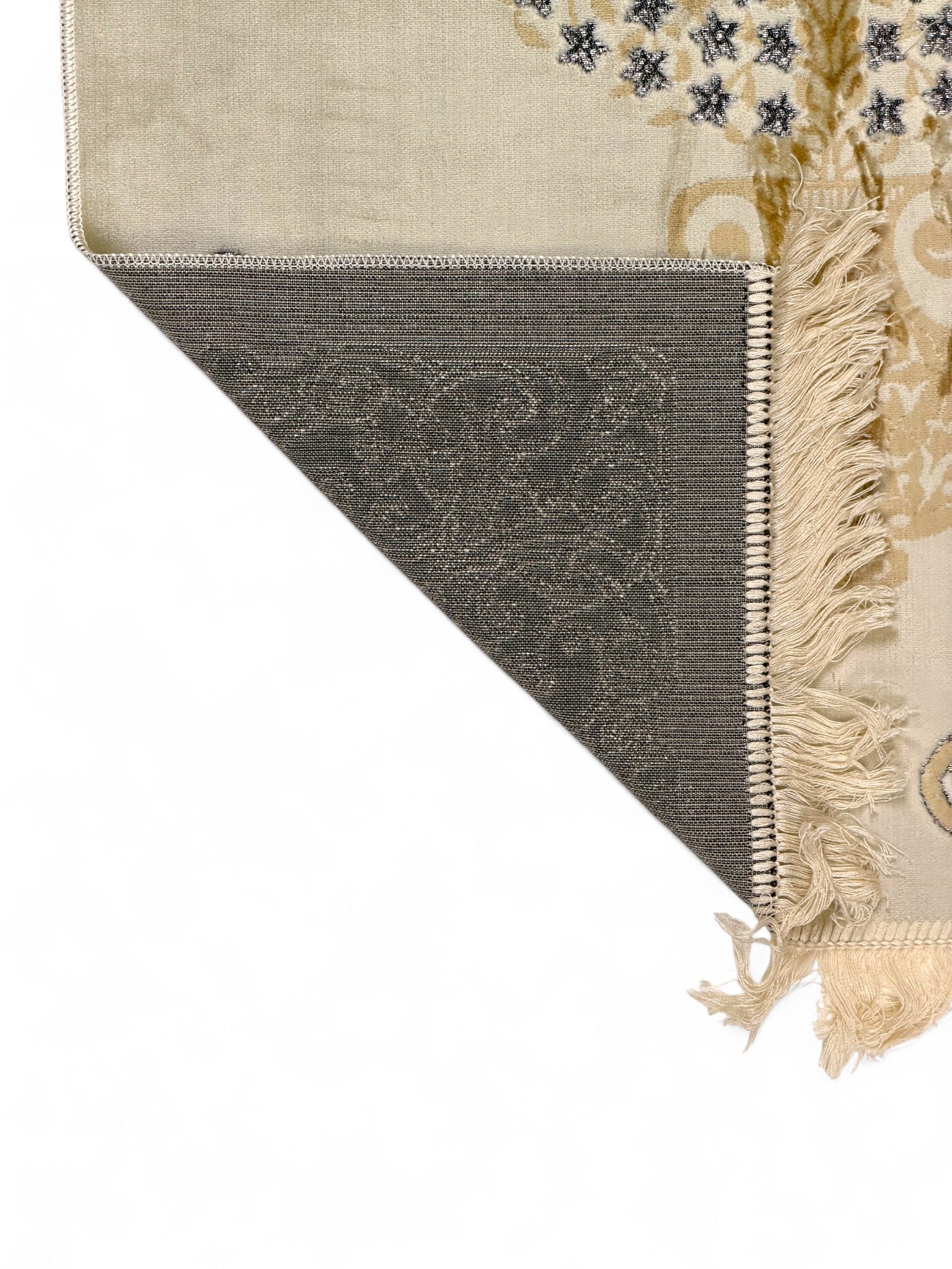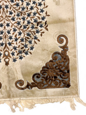 Bu kadife simli dokuma seccade, özel dokusu ve göz alıcı desenleriyle hem klasik hem modern bir şıklık sunar. İnce sim detayları, seccadenin ışıkla buluştuğu her anda ışıltılı bir görünüm oluşturur.