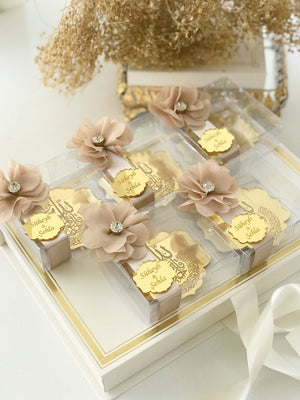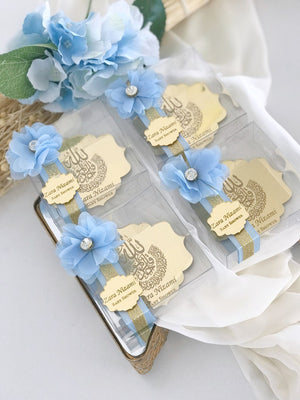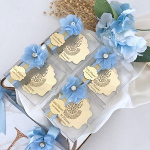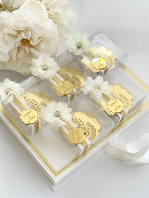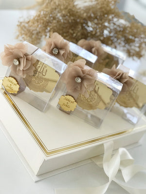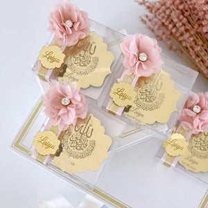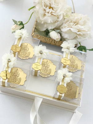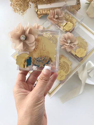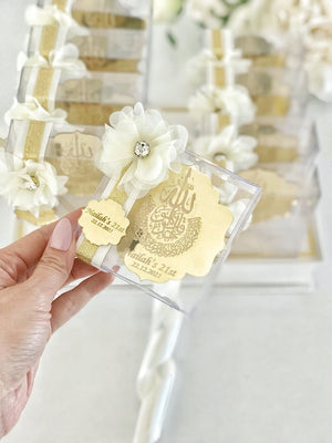 Altın pleksi üzerine lazer kesim Ayetel Kürsi ile hazırlanan bu özel hediyelik, şeffaf kutusu, taş detaylı çiçek süslemesi ve kişiye özel etiket tasarımıyla misafirlerinize hem estetik hem de manevi bir hatıra sunar.
