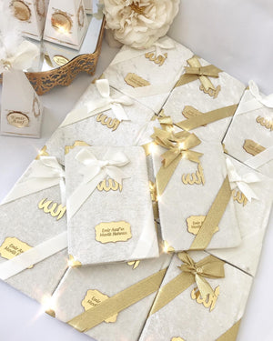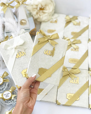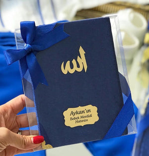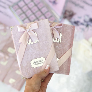📖✨ Kadife dış kaplaması, inci veya taş süslemeleri ve kişiye özel isim/dualarla tamamlanan bu özel ürün, İslami davetler ve özel günlerde dağıtılabilecek şık ve kalıcı bir hatıradır.