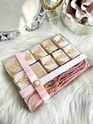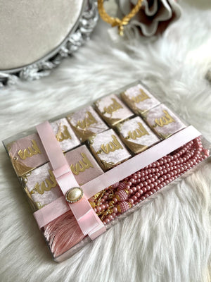 📿📖 Kişiye özel pembe mini Kur’an ve tesbih seti, Ramazan, bayram, amin günü veya hac dönüşü gibi özel zamanlarda sunulabilecek anlamlı ve şık bir armağandır. Zarif kutusu ve kişiye özel detayları ile kalplere dokunur.