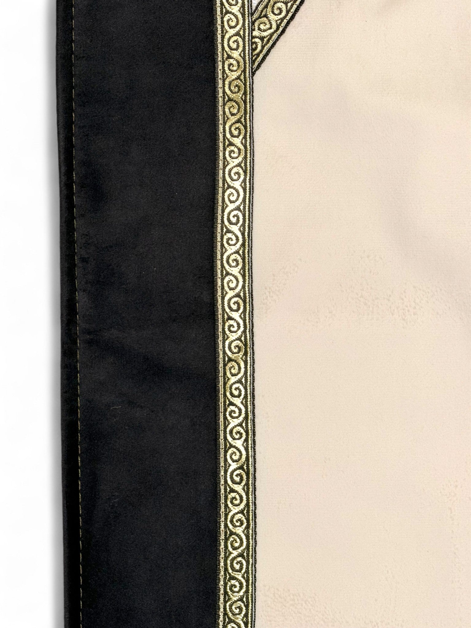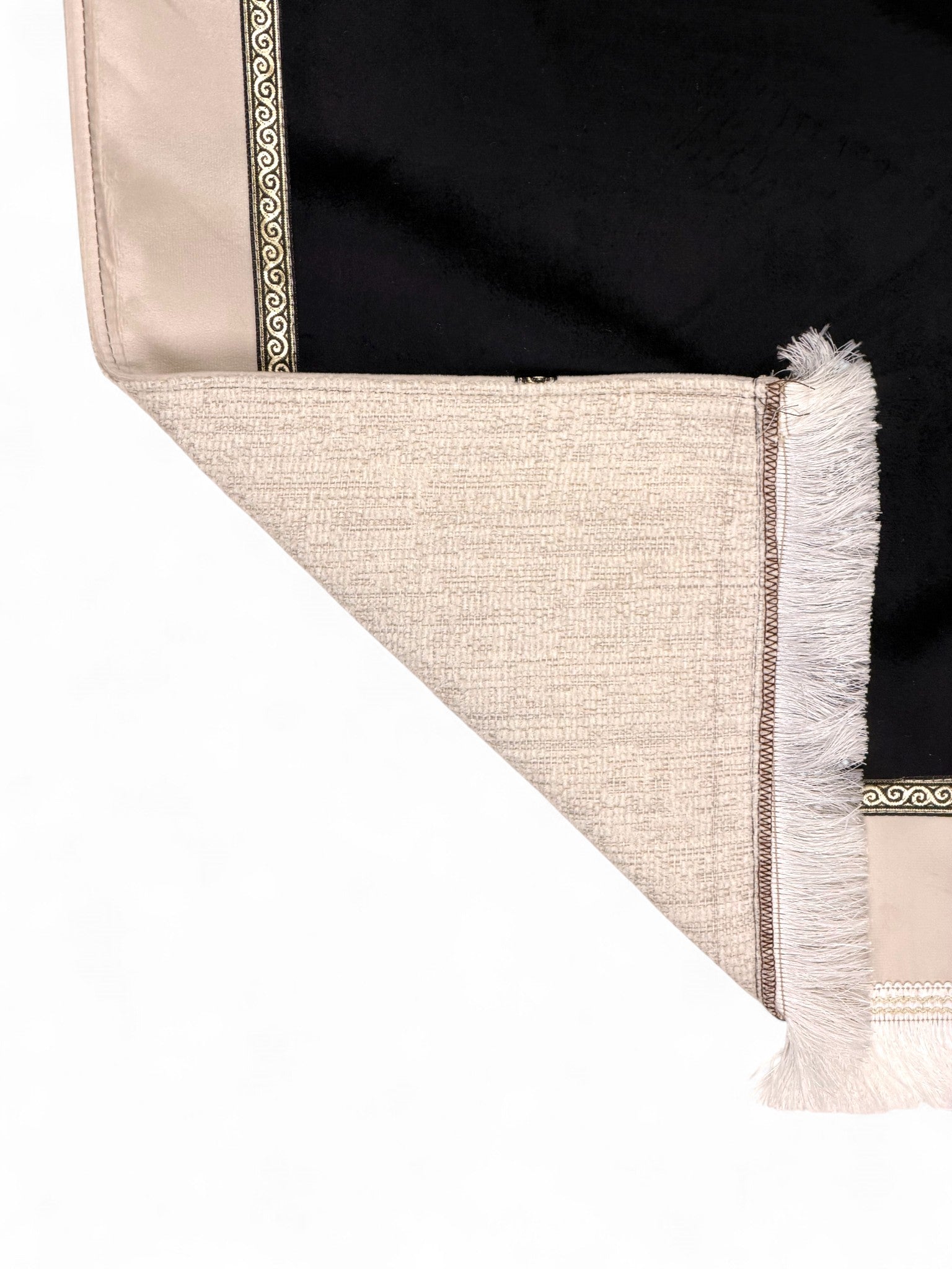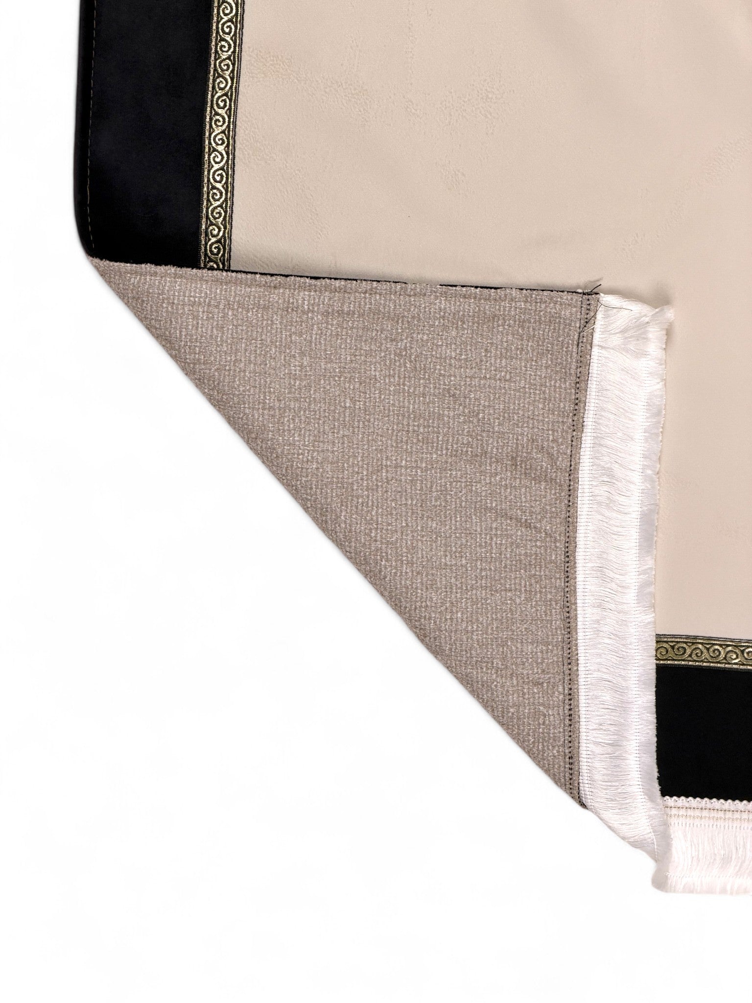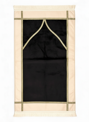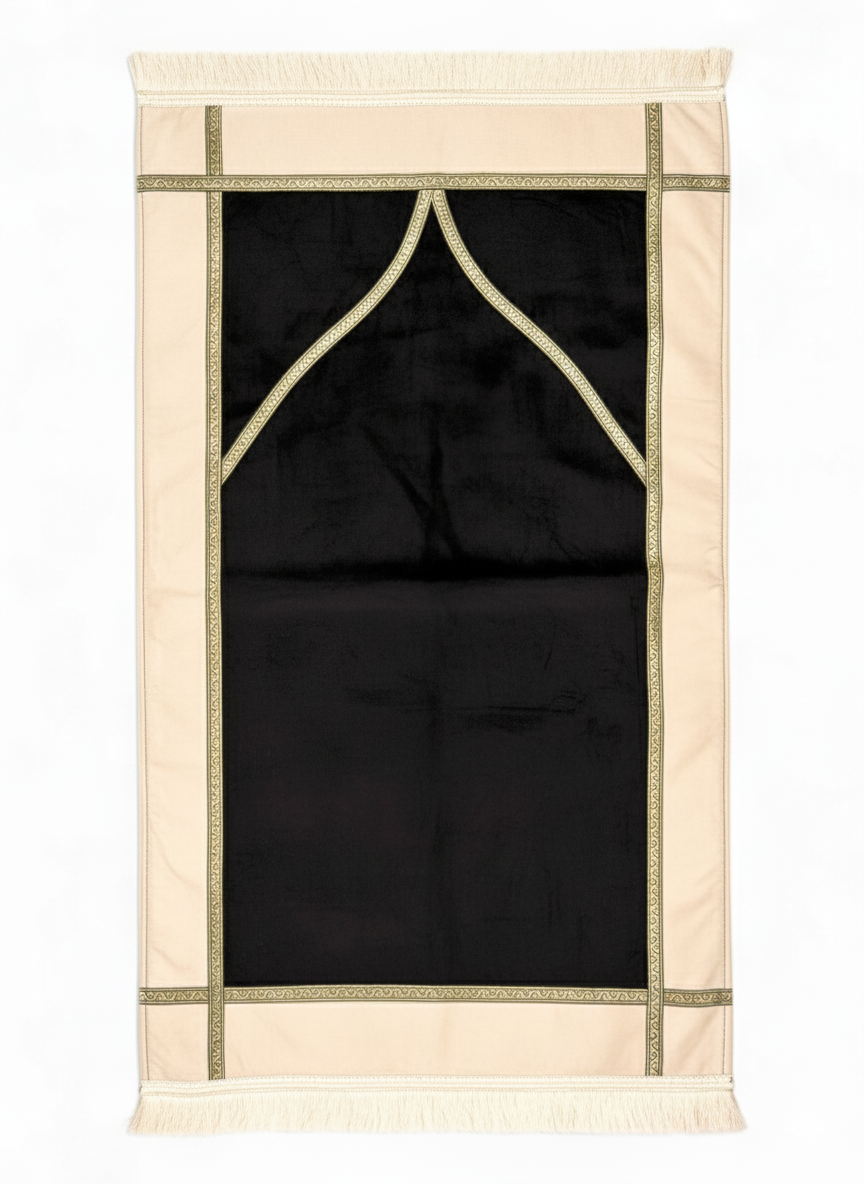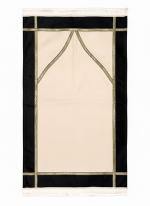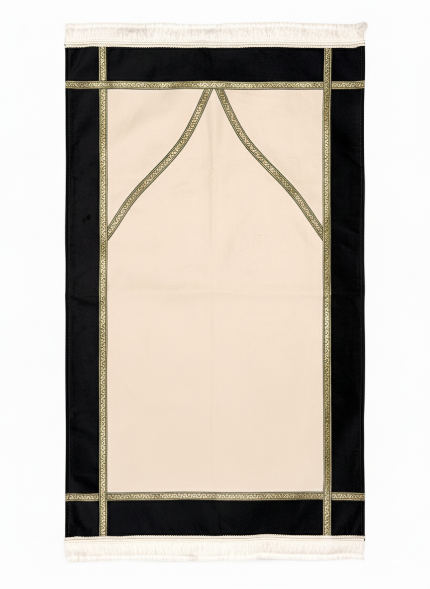 Krem ve siyah tonların asil uyumu, altın detaylı hat süslemeleriyle birleşerek seccadeye modern bir duruş kazandırır. 🌙