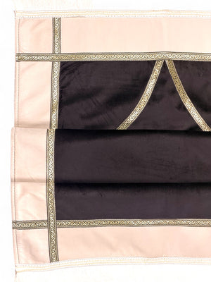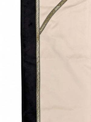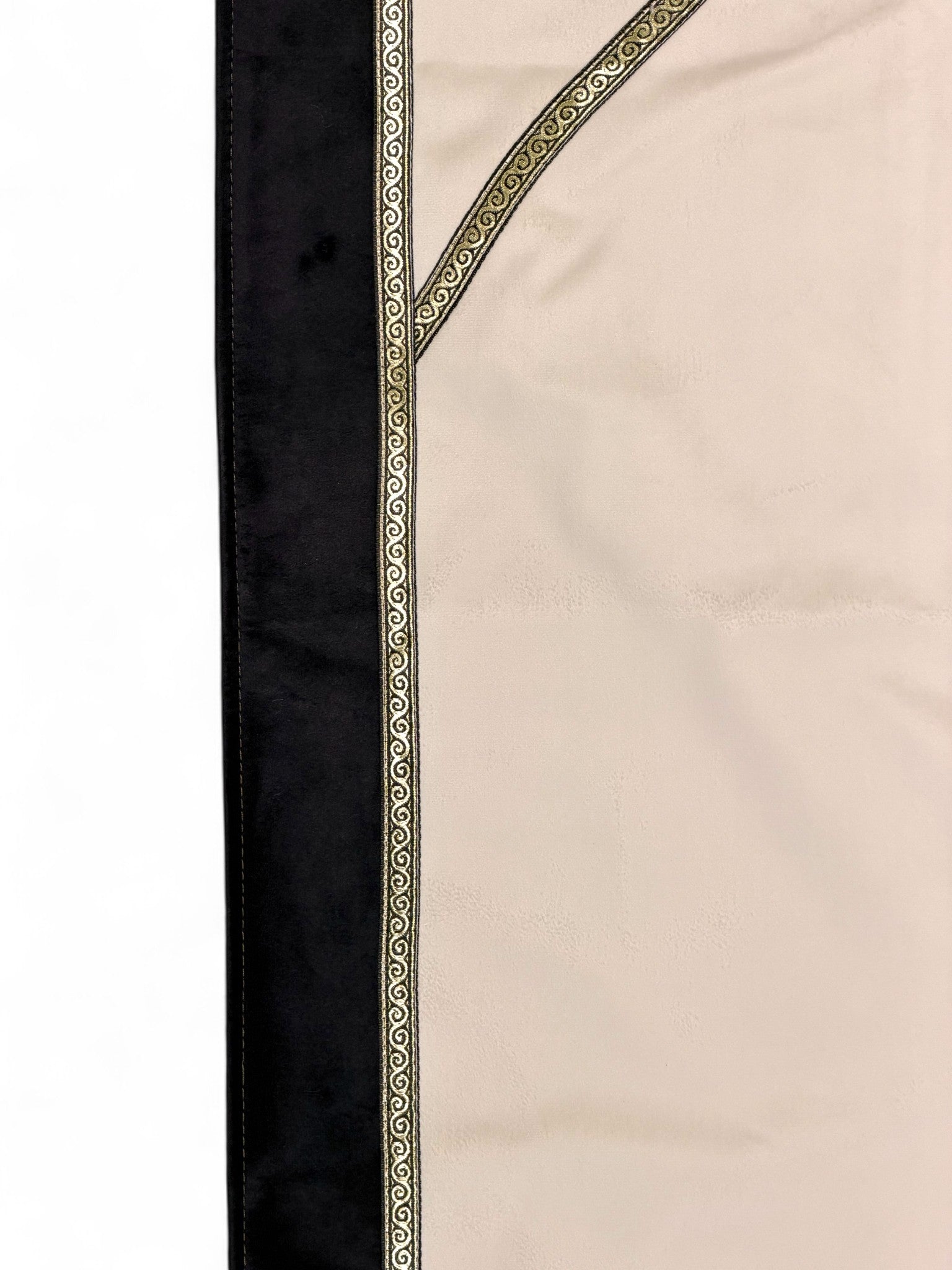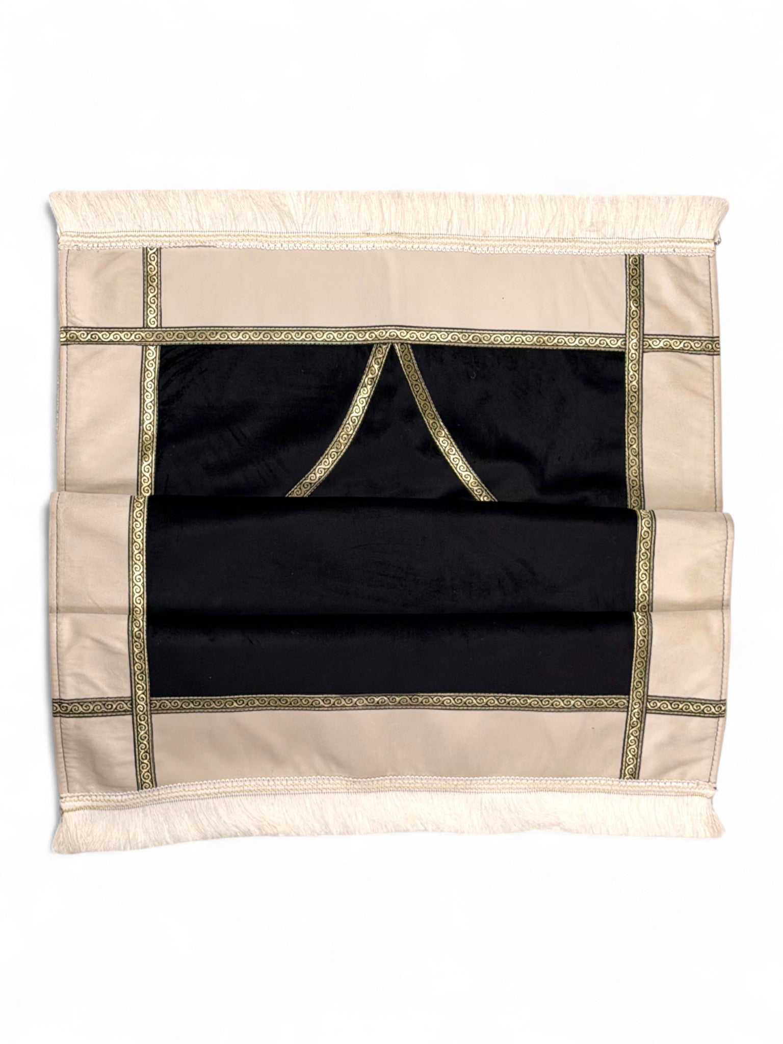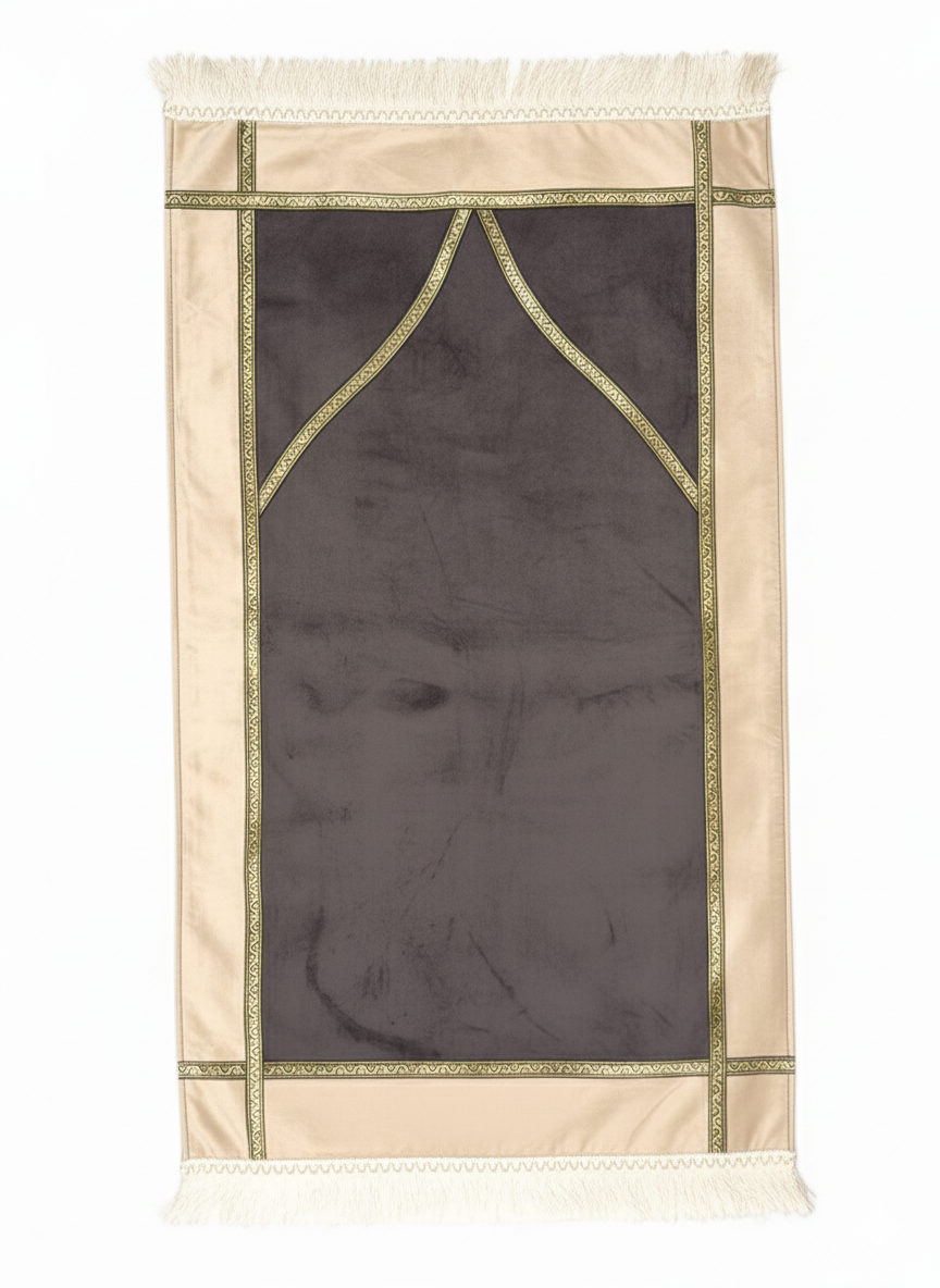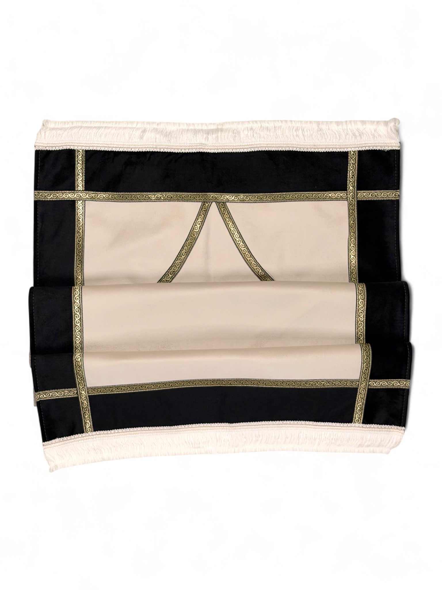 Krem ve siyah tonların asil uyumu, altın detaylı hat süslemeleriyle birleşerek seccadeye modern bir duruş kazandırır. 🌙