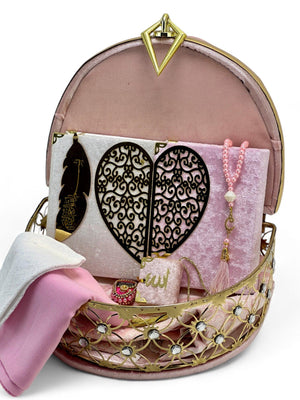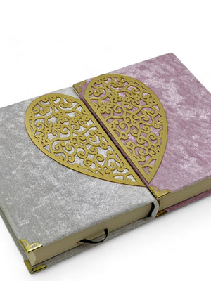 "Lüks Kadife Kur’an Kutusu içinde yer alan 2 Çanta Boy Kur’an-ı Kerim, 2 Ayraç, 1 Eşarp, 1 Takke ve 2 Tesbih ile sevdiklerinize anlamlı ve şık bir hediye sunun. Özel kalpli kutusunda zarif bir şekilde saklanan bu set, İslami hediyelikler arasında en özel seçeneklerden biridir. Düğün, nişan, mevlit veya özel dini günler için mükemmel bir hediye alternatifi olan bu set, maneviyatı ve estetiği bir arada sunar."