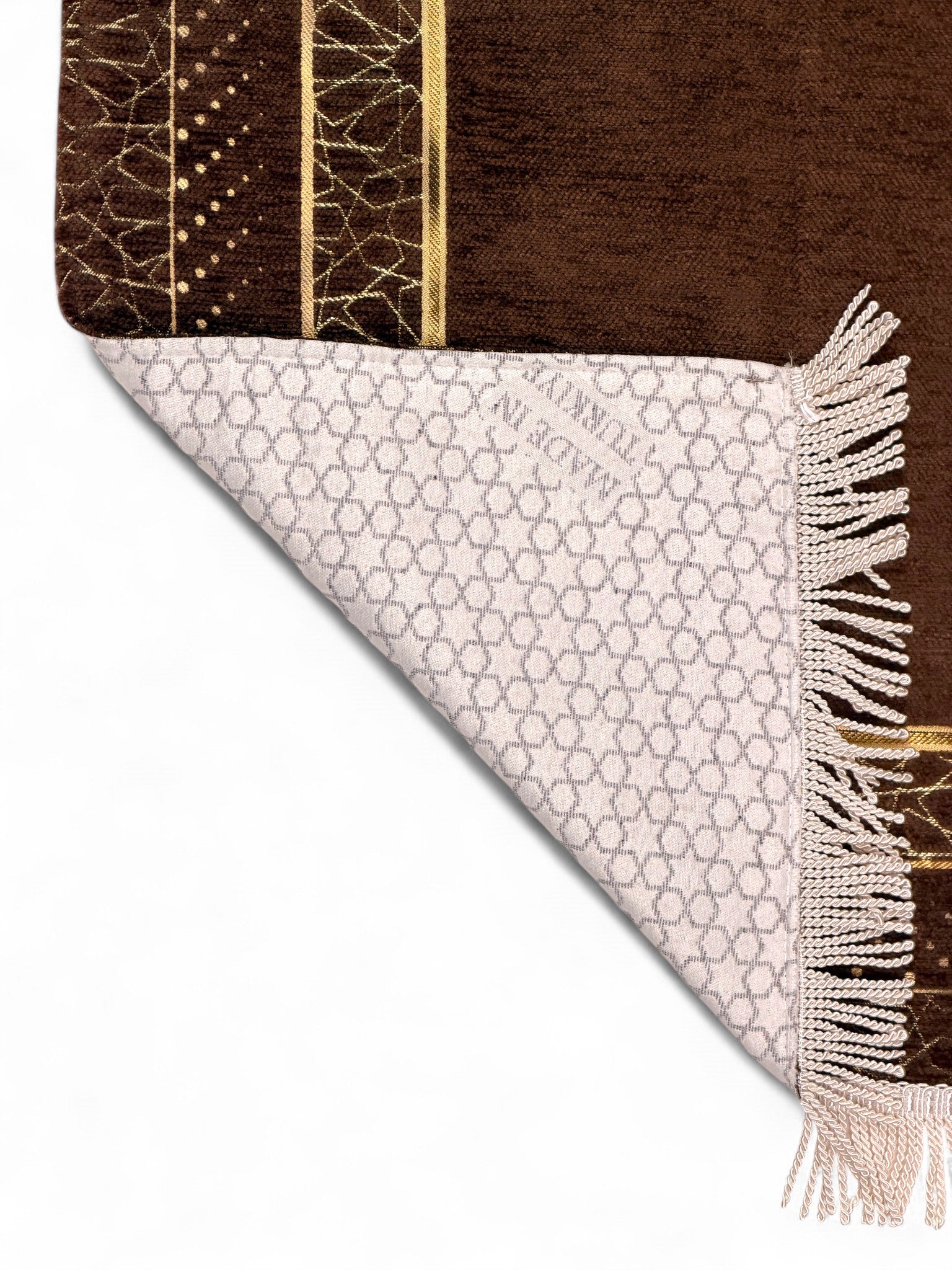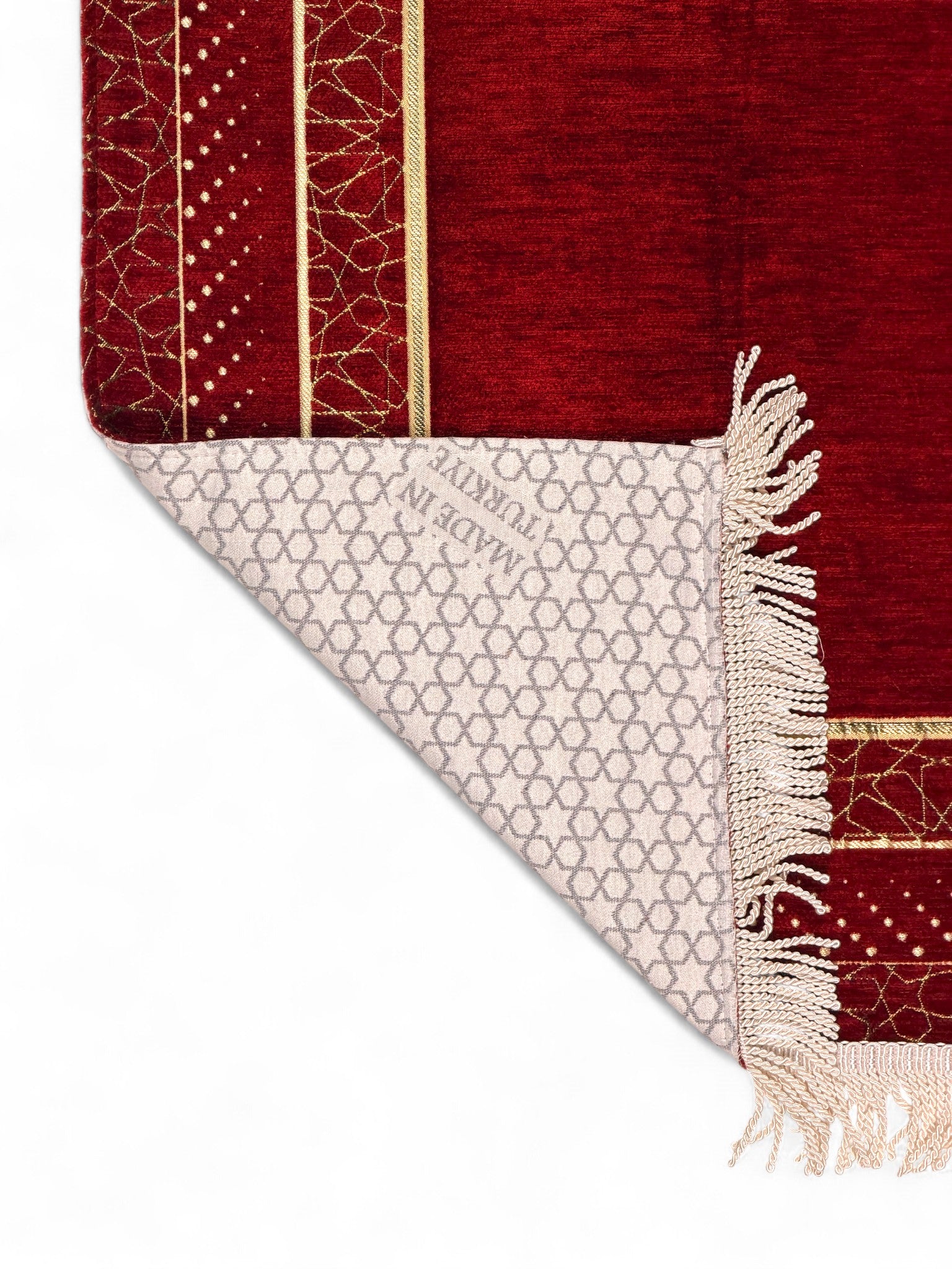 Zarafeti ve huzuru bir araya getiren bu mihrap desenli astarlı şönil seccade, klasik çizgileriyle göz alıcı bir şıklık sunar.