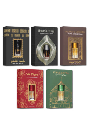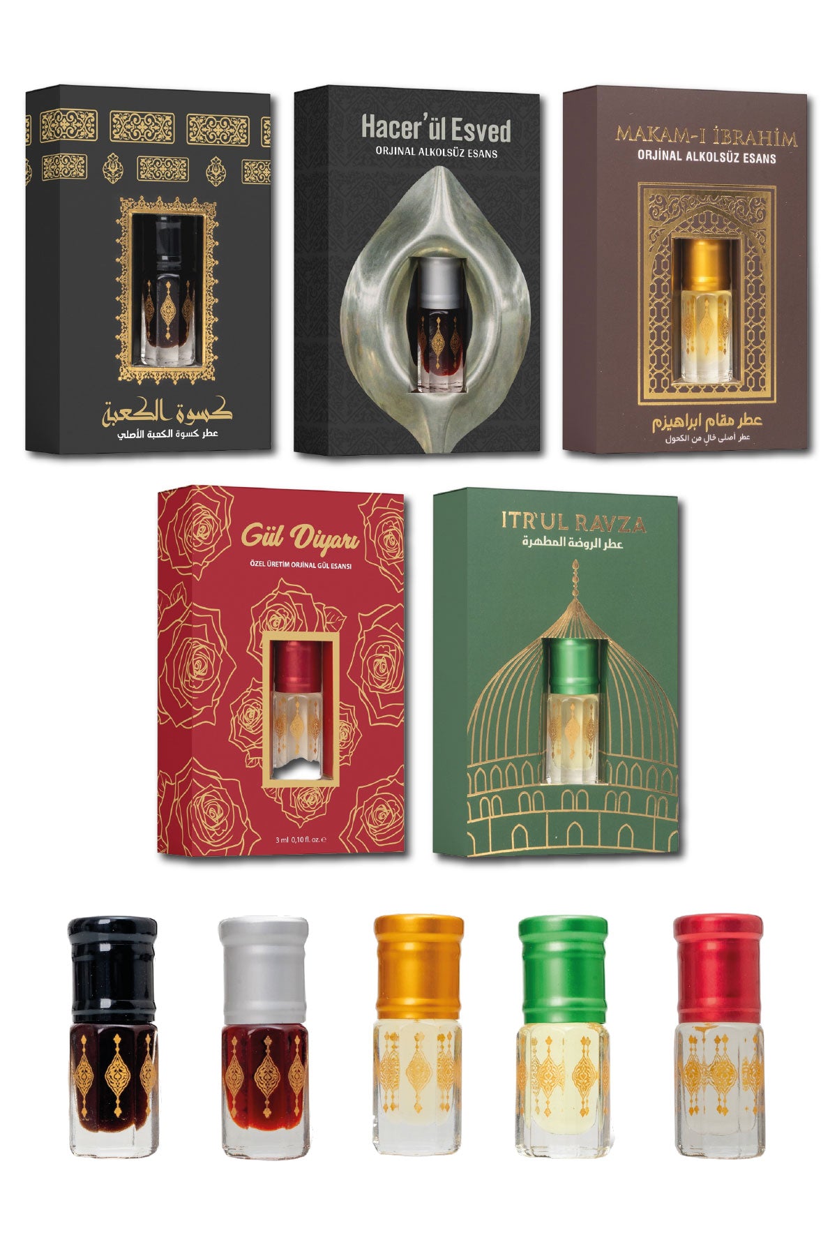 Orijinal Alkolsüz Esans 5’li Set – Hacer’ül Esved, Kâbe Örtüsü, Makam-ı İbrahim, Gül Diyar, Ravza