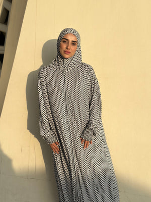 Günlük kullanıma ve ibadetleriniz için özel olarak tasarlanan bu pamuklu kendinden boneli namaz elbisesi, hafif ve nefes alan yapısıyla gün boyu rahatlık sunar. Şık desenli kumaşı, modern ve zarif bir görünüm oluştururken, kendinden boneli yapısı sayesinde ekstra eşarp takma ihtiyacını ortadan kaldırır.