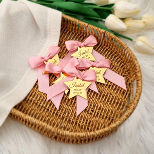 Altın pleksi üzerine lazer kazımalı isim ve tarih yazısı, zarif pembe fiyonk kurdelesiyle birleşerek doğum günü, baby shower, nişan, söz, kına ve tüm kutlamalarınız için unutulmaz bir hediyelik haline geliyor.